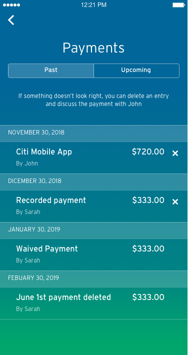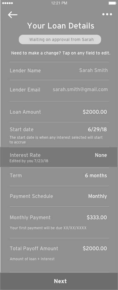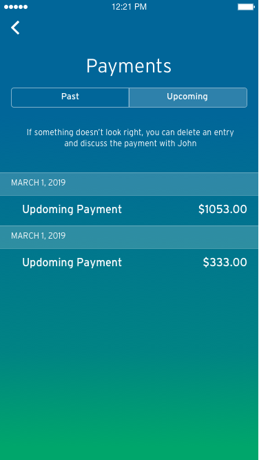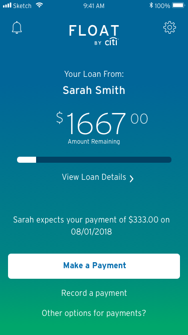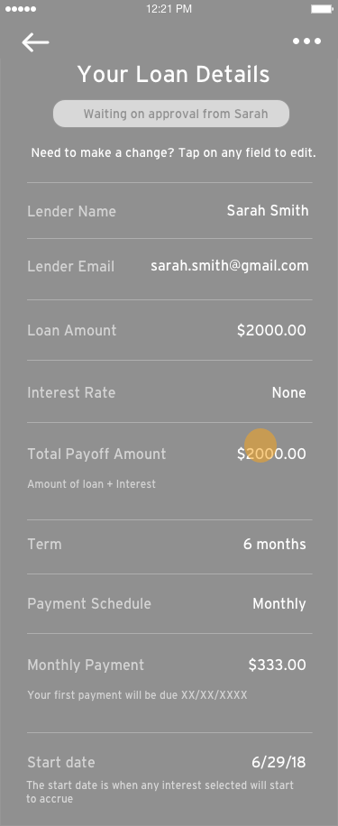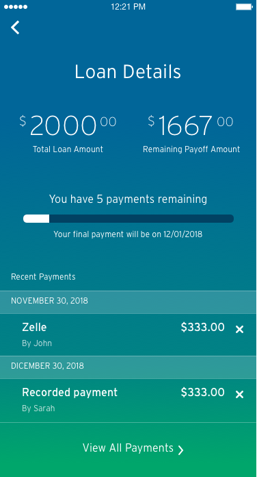 My research has shown that only 32% of the loans created between family and friends are paid in full. A lot of these loans are based upon the “honor system” with a verbal agreement and are not accompanied by any iron clad agreement between the lender and borrower. I set out to change this low repayment percentage by offering consumers an app they could use to create a loan agreement, track payments and become more financially responsible and accountable.